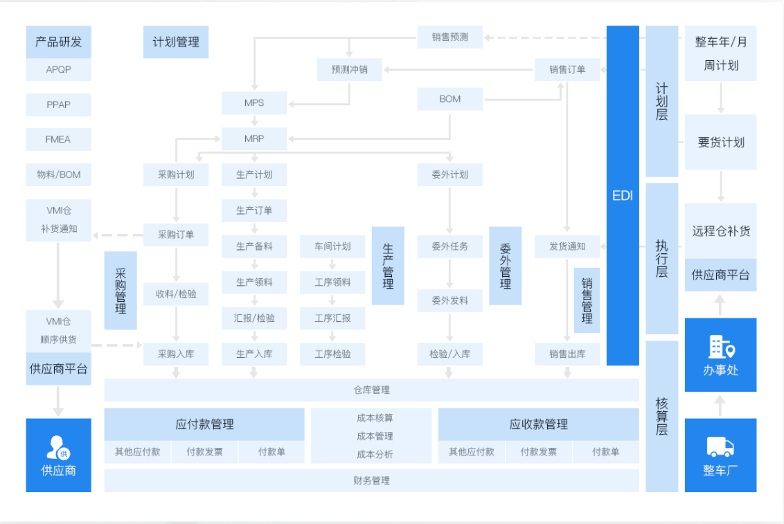 圍繞精細化計劃管控、透明化化生產(chǎn)執(zhí)行、全面質(zhì)量管理等作為落地支撐,助力汽車零部件廠商從訂單接收、計劃、生產(chǎn)執(zhí)行到售后及追溯的全流程管控
